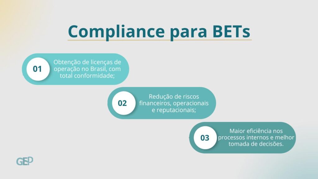 Dê o próximo passo para a conformidade legal (compliance) da sua BET. Quer saber como a GEP Compliance pode apoiar a sua BET na transformação da conformidade legal (compliance) em uma vantagem competitiva? Então, clica aqui e garanta todos esses benefícios